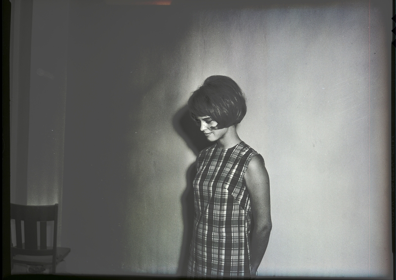 - Marnie Kreilkamp, dressed in a striped dress, shows off her short bob hairstyle from a profile view. A chair is visible in the background.