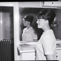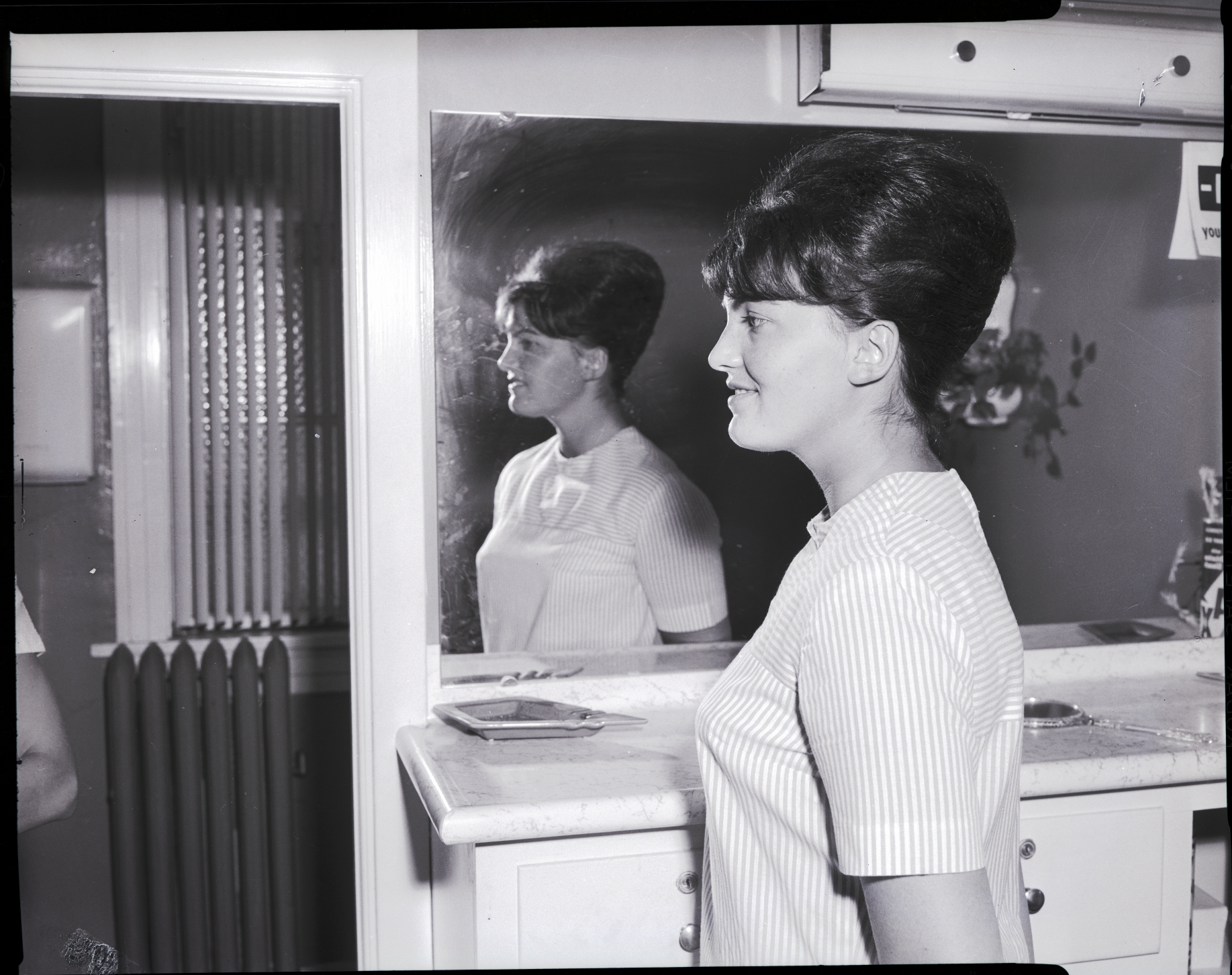 Sue Reese, dressed in a striped shirt, shows off her French twist hairstyle from a profile view. She stands in a bathroom, and her image is reflected in a mirror. In front of the mirror is a dresser, and a small hand mirror sits on top of it. A heater and a window are in the background.