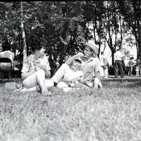Mr. and Mrs. Weston Webb and their son Kevan sit on the grass eating fried chicken at the 18th Annual BPOE picnic. Mrs. Webb is wearing sunglasses, and Mr. Webb is wearing a cowboy hat. A purse sits on the ground next to Mrs. Webb. A group of people are gathered in the background, several sitting in folding chairs and lawn chairs under the shade of the trees.