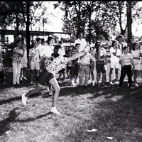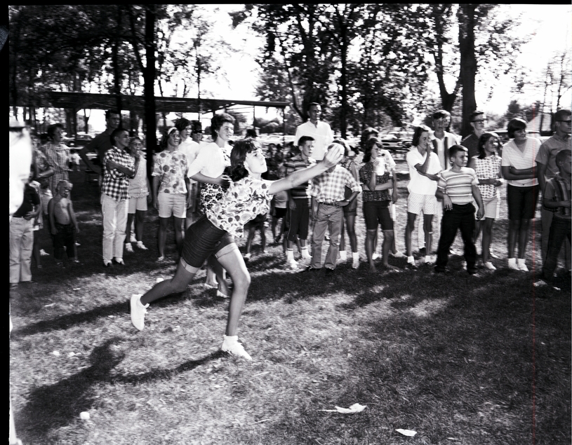 A young woman in a blouse, shorts, and stockings throws a Frisbee at the 18th Annual BPOE picnic. A group of people are behind her, watching. In the background behind the gathering of men, women, and children, the trees of the fairgrounds, a lattice roof, and some parked automobiles (cars) are visible.