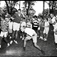 Ken Masoner, son of Mr. and Mrs. Elwood Masoner, competes in an egg-throwing contest at the 18th Annual BPOE picnic. A man in a v-neck shirt and shorts and a boy in a striped shirt and shorts are to the side. Around them is a group of people watching. In the background behind the gathering of men, women, and children, the trees of the fairground and some parked automobiles (cars) and houses are visible.