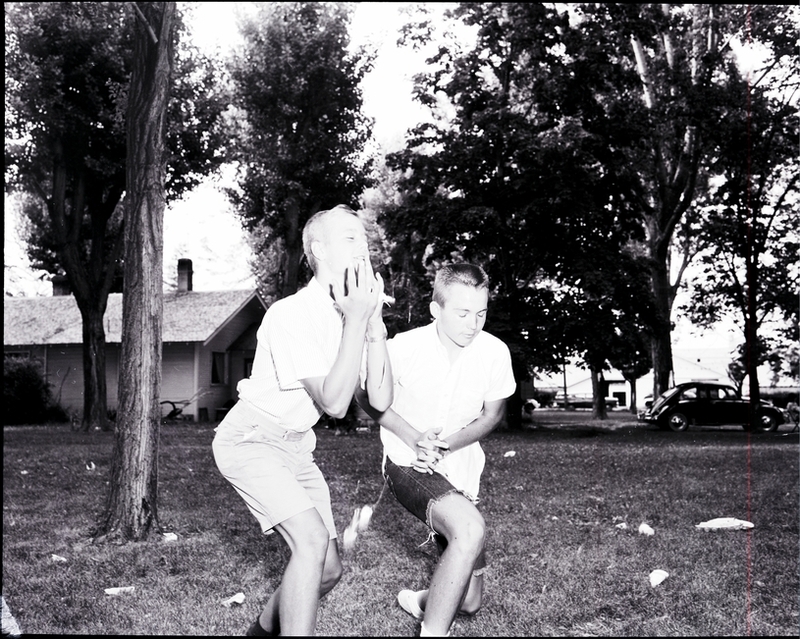Egg white dribbles down the arms and shirt of Ken Masoner, son of Mr. and Mrs. Elwood Masoner, after competing in the egg-throwing contest at the 18th Annual BPOE picnic. John Jensen, son of Mr. and Mrs. Don Jensen, stands beside him. They are both wearing white shirts and shorts. In the background the trees of the fairground, a parked automobile (car), and a house are visible.