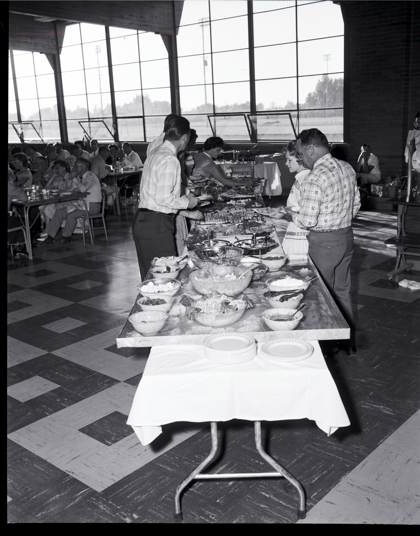 Square dancers attending the Idaho State Square Dance Festival enjoy a smorgasbord in the Twin Falls High School cafeteria. Several men and women help themselves to the buffet table, which has several bowls of salads, fried chicken, grapes, and bread, among other food items. Other dancers sit at the tables eating. Large windows show a sports field in the background.