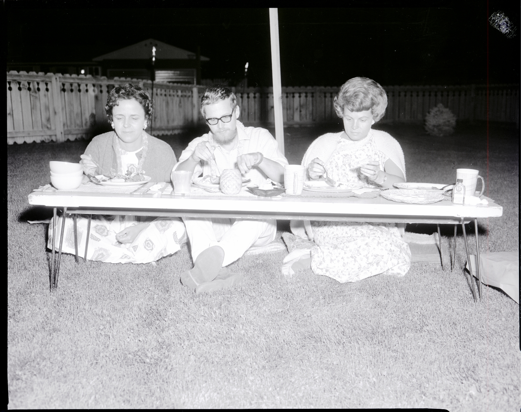 From left to right, Mrs. Richard High, Lawrence Gould, and Probate Judge Zoe Ann Warberg sit on the ground at a low table eating dinner at Mrs. Charles Hopkins Hawaiian luau in honor of six members of the Experiment in International Living. They all wear leis around their necks. Pine trees, tiki torches, the fence around the backyard, and a gazebo next door are in the background.