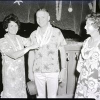 Mrs. Charles Hopkins, left, presents Ivan Skinner with a lei at her Hawaiian luau in honor of six members of the Experiment in International Living. Mr. Skinner is chairman of the group of local citizens working with the Experiment program. Mrs. Ivan Skinner, right, watches. They are all dressed in floral print clothes with leis around their necks. Behind them, some netting with hanging leis and starfish is used as decoration. The fence around the yard and a parked automobile (car) are in the background.