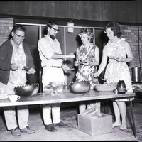 Two men and two women stand beside a table covered in bowls of salad, helping themselves to the potluck dinner buffet at Mrs. Charles Hopkins Hawaiian luau in honor of six members of the Experiment in International Living. The second man from the left is Lawrence Gould. They are all wearing leis around their necks, and the women have flowers in their hair. The side of the house is in the background.
