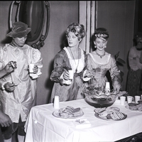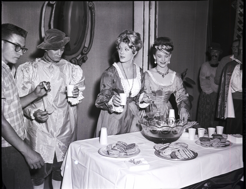 Some actors and guests enjoy refreshments at the "Bourgeois Gentleman" play in Buhl. Joyce Conrad, left, and Sharie Baggs, right, both dressed in their costumes, help themselves to some punch. To the left a man dressed in a ruffled shirt and a hat hold a cup and a cookie. A young man in a plaid shirt stands beside him holding a cookie. On the table in front of them is a bowl of punch and several platters of cookies. A group of other dressed actors are seen in the corner. Cardboard props of a mirror and a castle facade and some potted plants decorate the background.
