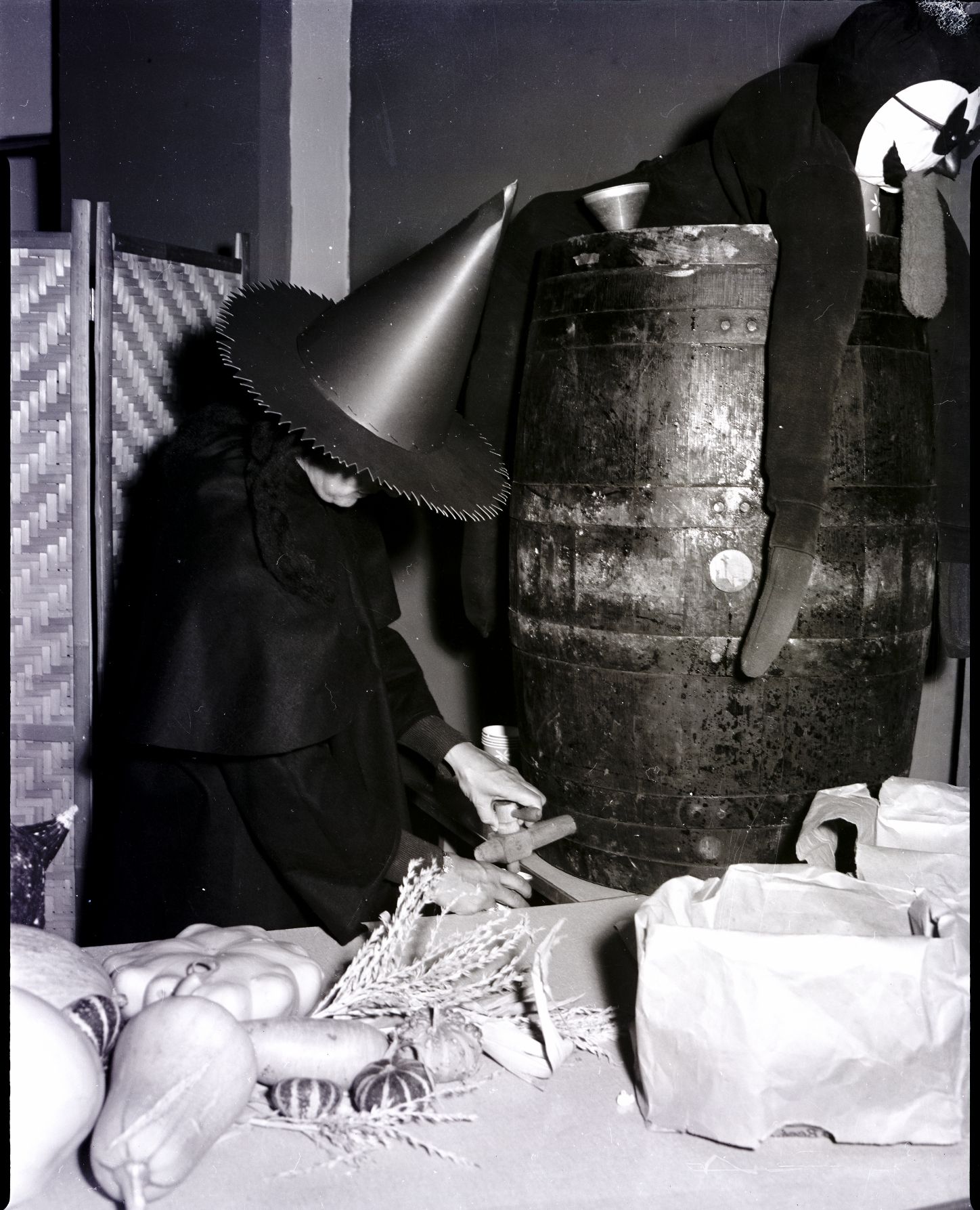 A woman dressed in a black robe and witch hat dispenses some cider from a large wooden barrel at the Newcomers Couples Club Halloween Party held at the Rogerson Hotel. A dressed up dummy sits on top of the barrel. On the table in front of her are various different pumpkins, squashes, and grains. Some paper sacks sit on the table to the side of the squash.