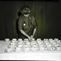 Mrs. L. J. Robertson, president of the Newcomers Couples Club, serves huge slices of pie decorated with plastic bugs at the Newcomers Couples Club Halloween Party held at the Rogerson Hotel. A stack of napkins sits on the table next to the plates of pie. She is wearing a dress with a witch pin on the front.