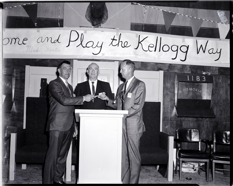 State officers Virgil McKenzie, Weldon Haskins, and William S. Hawkins stand behind a podium at a BPOE convention held in Twin Falls. Mr. McKenzie hands Mr. Hawkins a gavel. All three men are dressed in suits and ties. Three large plush chairs are behind the men. Some chairs and an ashtray are in the corner. On the back wall is a display that reads "1183 In Memoriam." Hanging from the ceiling above the men is a string of pennants and a banner that reads "Come and Play the Kellogg Way Midwinter Convention '66." An elk head is mounted high on the wall in the background.