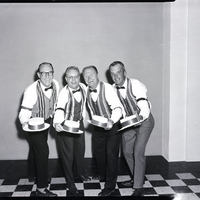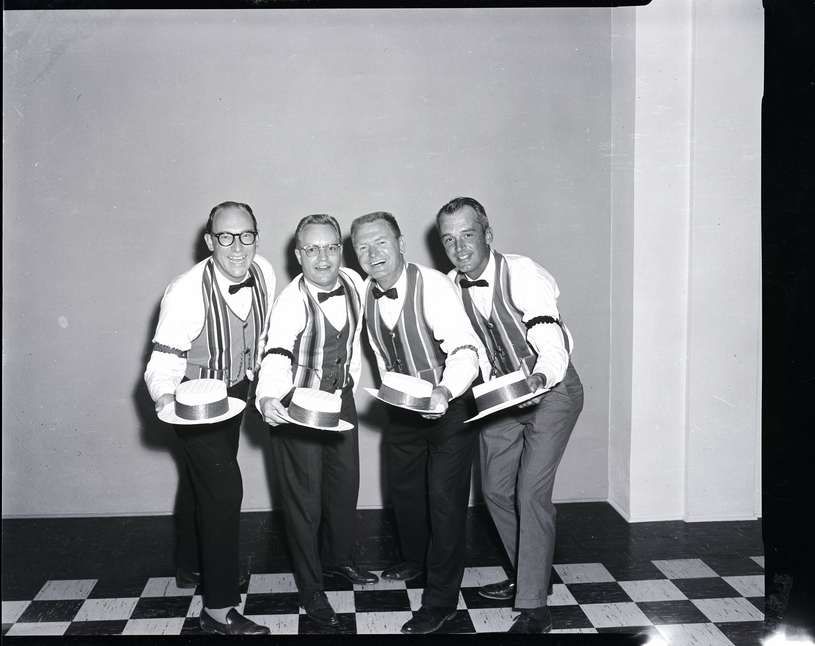 Dilettantes members Ivan Squires, Del Slaughter, Henry Wills, and James La Grone, dressed in striped vests and bow ties, pose with their hats after being selected for the Dilettante Group of the Magic Valley's production of "The Music Man."