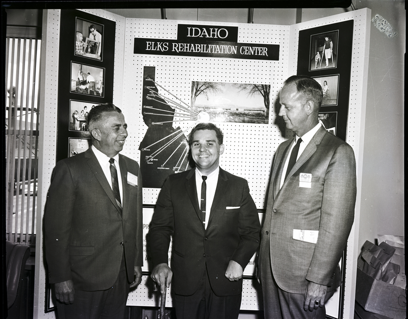 From left to right, Chet Stahl, chairman of the hospital board, DeLoy Giles, patient of the Elks Rehabilitation Center, and Weldon Haskins, Elks state president, stand in front of a display for the Idaho Elks Rehabilitation Center at a BPOE convention held in Twin Falls. The men are dressed in suits and ties, and Mr. Giles holds a cane. Mr. Giles, who lived at the Elks Rehabilitation Center in Boise on and off for fifteen years after being almost completely paralyzed in a logging accident when he
