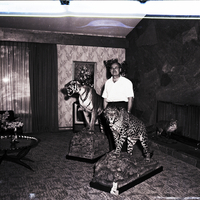Edward F. Pedersen stands beside a tiger and a leopard he acquired on a hunting safari in Nagpur, India. In front of the fireplace behind him is a stuffed fox. To the side is a coffee table that has a vase of flowers on it. In the background is a couch, a large window covered in drapes, a television, a potted tree, and a painting of a vase of flowers hanging on the wall.