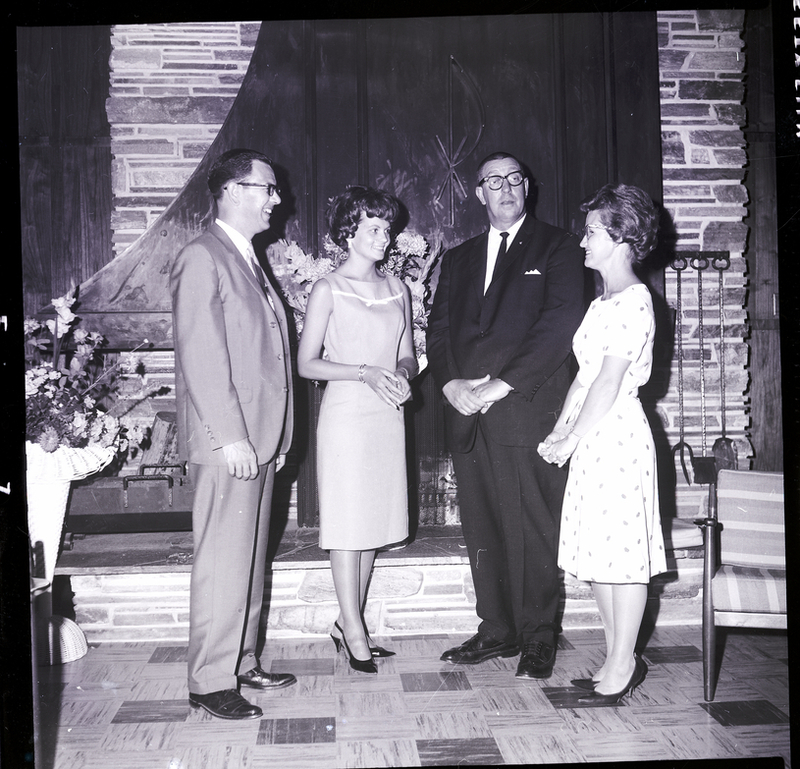 Discussing progress of the College of Southern Idaho during an open house in the social hall of the First Presbyterian Church, are, from left to right, Dr. Don Keith, dean of men, Probate Judge Zoe Ann Shaub, Dr. James L. Taylor, college president, and Mrs. Eldon Evans, whose husband is a member of the board of regents. The men are wearing suits and ties and the women are wearing dresses. Behind them is a fireplace, and a bouquet of flowers is on the mantle. A large vase of flowers is to the side, and a chair to the other side.