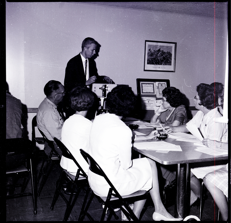 Christ Rouseff, president of the DEK Processing Company, demonstrates the new photo recorder for driver's license photographs. A man and several women in dresses are seated in folding chairs around the table watching. Around thirty representatives of driver license bureaus of nine counties attended the demonstration at the American Legion Hall in Twin Falls. Papers and ashtrays are on the desk. Chairs surround the desk. A painting hangs on the back wall. In the corner is a bulletin board with certificates pinned on it. A painting hangs on the back wall.