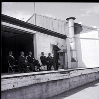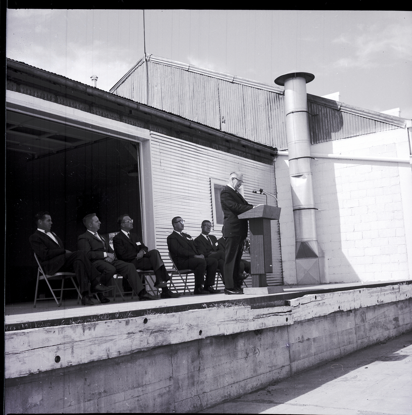 Senator Len B. Jordan stands at a podium giving a speech at a dedication for the CSI Vocational School on Kimberly Road. Several other men sit in folding chairs behind him, including Dr. James L. Taylor and Robert Blastock Jr. All of them are dressed in suits and ties. They are on the upraised porch of the vocational building, and an open garage door is behind them.