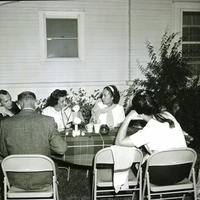 The Art Guild of the Magic Valley gathers in the backyard of the home of Mr. and Mrs. Earl Peck for a barbecue marking the end of the fiscal year. The men and women are seated in folding chairs at a long table covered in a plaid table cloth. Plates, silverware, cups, and a centerpiece of a doll holding a painter's palette are on the table. A candle and some loose flowers also on the center of the table. A pack of cigarettes sits on the table beside of the women. The houses and some bushes are in the background.