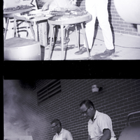 Cooking steaks on barbecues at the First Annual Twin Falls YMCA Men's Steak Barbecue is Lou Thorson, left, and Lloyd Bledsoe, right. The barbecue was to raise funds for programming and operating expenses of the YMCA. The two men are wearing aprons. A sign reading "YMCA Parking" is propped up against a wall to the side of the barbecues. The brick building is in the background behind them.