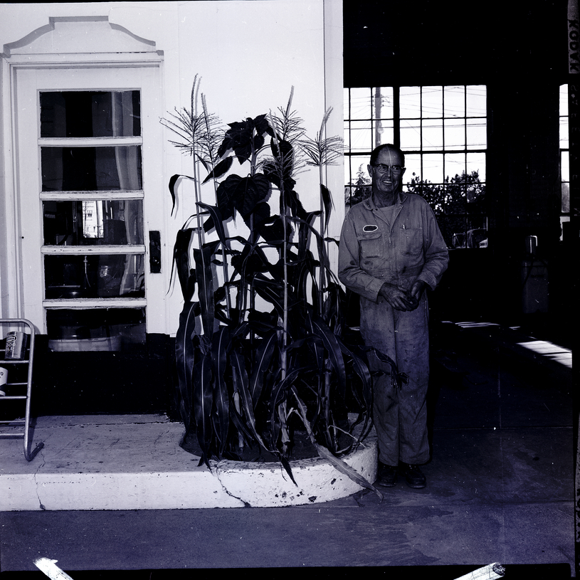 Sterling Alexander, manager of the Union Motors Service Station in Twin Falls, stands beside stalks of corn in a planter which serve as ornaments for the service station. To his side is the front door to the office, and behind him is the garage. Trees can be seen through the windows at the back of the garage.