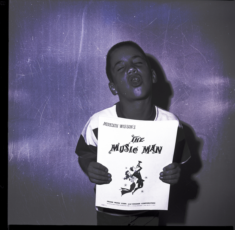 Timothy Driscoll, son of Mr. and Mrs. Tom Driscoll, tries out to play the part of Winthrop in the Dilettante's production of "The Music Man." He holds a copy of the script, and the front of it reads "Meredith Willson's The Music Man, Frank Music Corp. and Rinimer Corperation."