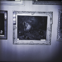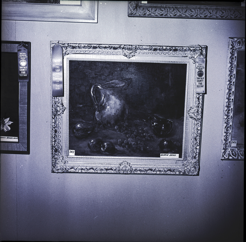 An oil painting of a pitcher, teapot, and some fruit titled "Red Still Life" by Mrs. Harley F. Hann, a member of the Art Guild of the Magic Valley, wins some awards at the Twin Falls County Fair. Two award ribbons hang from the corners of the frame. One reads "First Premium Still Life, All Media, Realistic" and the other reads "Best of Show." Tags reading "242" and "Gloria Hann" are in the bottom corners of the painting. The painting on the wall beside it has a ribbon reading "Second Premium Flowers, All Media, Realistic" and a tag in the corner reading "Henkelman."