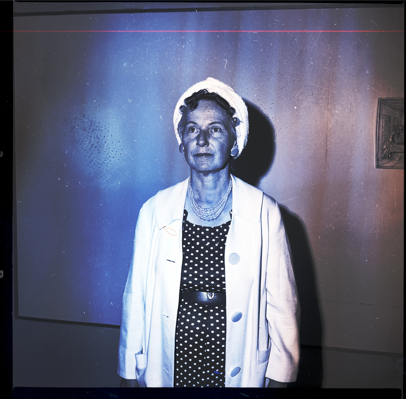 Frances Sande, organizer of the Interdenominational Divine Order, poses in a hallway at the I-Do building located on 519 Main Ave. W. in Twin Falls, Idaho. She is dressed in a polka dot dress, white jacket, and a white scarf wrapped around her head. A picture hangs on the wall behind her.