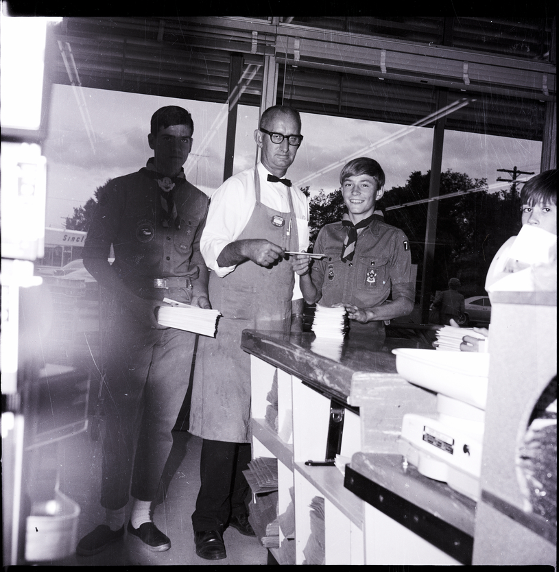Two boy scouts from troop 74, Craig Olson, left, and Bobby Babbel, right, hand a stack of leaflets providing information on the United Fund drive to Albertsons manager Bud Miller, center. Another boy is seen to the side of the counter. The boys are wearing their uniforms, while Bud Miller is wearing a white shirt, bow tie, and a long apron. Through the window behind them, a parking lot is visible, and a woman walks with a sack out to a parked autmobile (car). The sign of a Sinclair station is visible on the other side of the parking lot. Several trees are in the distance.