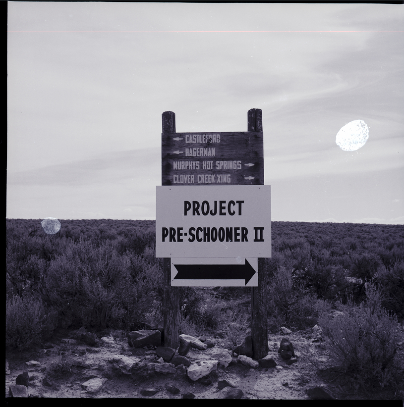 A wooden sign shows arrows pointing to the left for the direction of Castleford and Hagerman, and arrows pointing to the right for Murphy's Hot Springs and Clover Creek Crossing. Below then another sign as been added reading "Project Pre-Schooner II" with an arrow pointing to the right, showing the direction to the Project Pre-Schooner II site on Bruneau Plateau. Several rocks are below the sign, and in the distance behind it is a field of sagebrush.