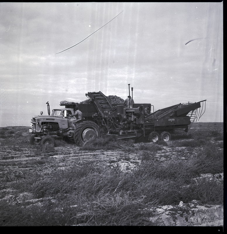 Harvesting potatoes near Jerome is one of several harvesters and crews of Charles Marshall. A two-row potato harvester truck is loaded with potatoes. Two men are at the front of the truck, while three others work in the back, looking over the potatoes. The truck is sitting in a field covered in dirt, weeds, and dead plants that stretches into the background.