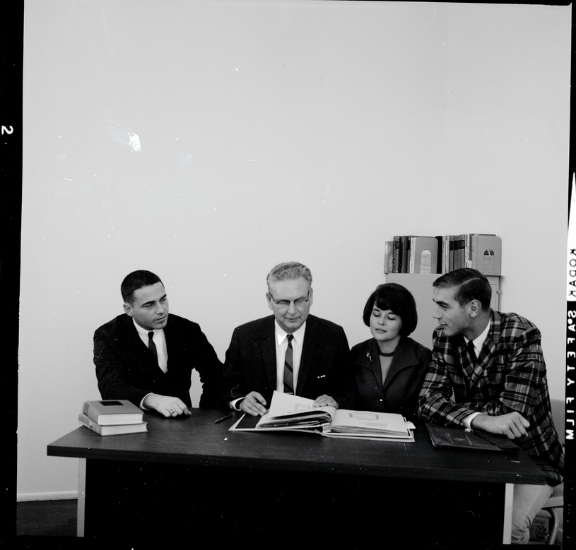 From left to right, Patrick Vecera, Howard Kiehlbauch, Barbara Frederickson, and Daniel Gruener sit behind a desk looking over some books for the mid-management club contests. The four are delegates from the College of Southern Idaho's Mid-Management Club that will compete in state competitions in Boise. A file cabinet with several books on top of it is in the background.