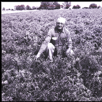 Edward Herzinger inspects from frozen alfalfa in a field. Mr. Herzinger estimates that the cold temperatures reduced his hay crop by at least 25 per cent. In addition, he said what hay was left was of lower quality because of the frost. A house and some trees can be seen in the background, beyond the field.