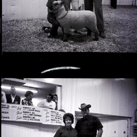 Jerome 4-H member Jeff Shewmaker kneels down beside his top sheep at the 4-H and FFA Fat Stock Show and Sale held at the Twin Falls Livestock Commission Company. Buyers Betty Locklear and John Locklear, of the Clear Span Construction Company, stand beside him. Several people look down into the show ring from above, and a banner hangs below them that reads "1962 Beef: Rangen's Inc. Sold by Bethene Patrick, Sheep: Rangen's Inc. Sold by Jane Southwick, Swine: Rangen's Inc. Sold by Rick Kruse. 1963 Beef Rangen's Inc. Sold by Terry Shaff, Sheep: Fidelity National Bank Sold by Mary Ann McCoy, Swine: Rangen's Inc. Sold by Rex Kruse."