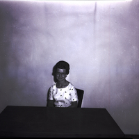 - Mrs. Eldon Evans, president of the Twin Falls chapter of the American Association of University Women, is seated behind a table. She is wearing a floral print dress.