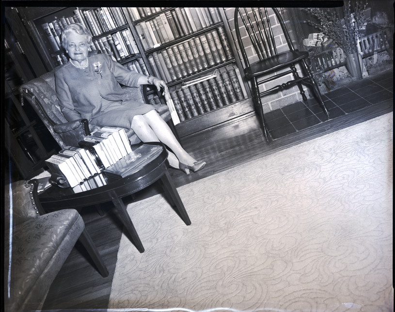 Mrs. John Hayes, president of the Twin Falls Ascension Guild of the Episcopal Church, sits in a recliner in a study. She is wearing a dress suit with a flower embroidered on the jacket. A bookcase is behind her, and beside her is a round table covered in books and a love seat. A fireplace is in the corner, and beside it are a vase and chair.