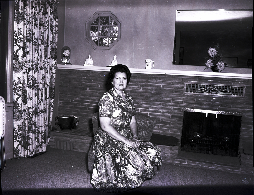 Mrs. John Leinen, president of the Ladies of the Elks, sits on a recliner in a living room. She is wearing a dress with a jungle print that shows palm tree fronds and parrots. Behind her is a fireplace, and on the mantle are a clock, some figurines, and a vase of flowers. A mirror hangs on the wall above the fireplace. Some curtains hang over a window to the side of the room.
