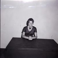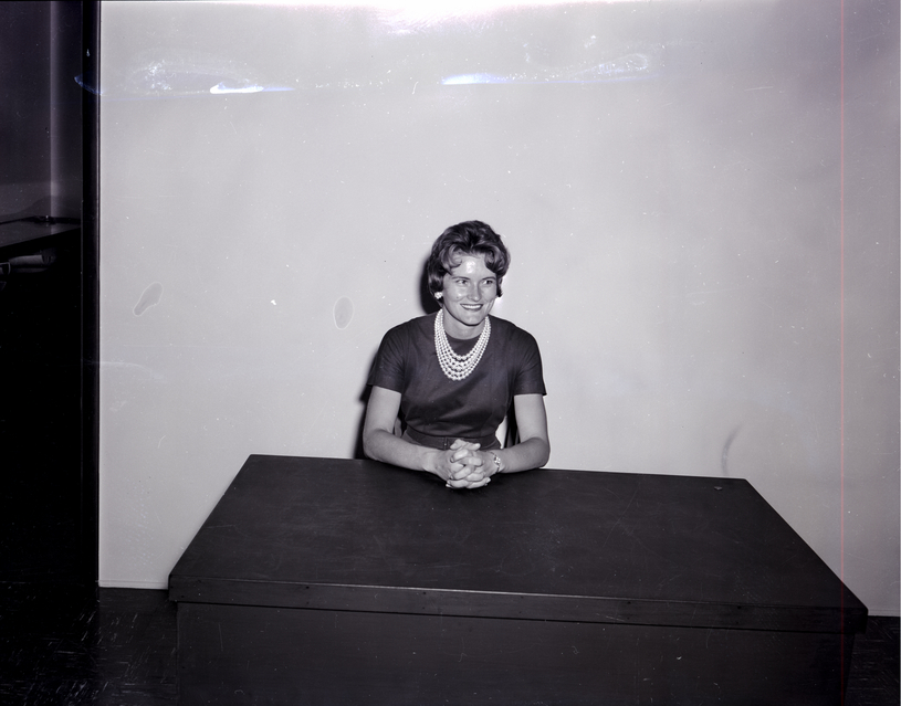 Mrs. Jim Turner, president of the Twin Falls chapter of the American Lutheran Churchwomen of Our Savior Lutheran Church, sits behind a desk. She is wearing a dress and several strings of pearls.