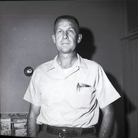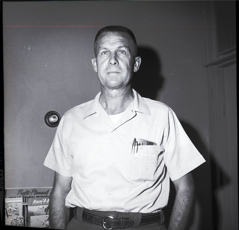 Rex Greer spoke about the development of land under sprinkler irrigation in the Snake River Plain as a big business during the Western annual meeting of the American Society of Civil Engineers and American Society of Agricultural Engineers held in Twin Falls. He is wearing a shirt with pins and a pocketbook in the front chest pocket. Some pamphlets are in a holder behind him.