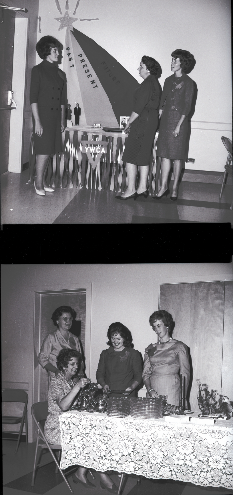 In the top image, three women gather in front of a display at a YWCA Wives Club event. On the display table are a male and female doll. Streamers hang from the side of the table with a YWCA logo. On the wall behind the display is a star with three strips of colored papered running down the wall reading "Past" "Present" and "Future." In the bottom image, four women gather around a table covered in a lacy tablecloth. Mrs. Lynn Popplewell is seated by the table in a folding chair and pours coffee from a silver coffee pot into a cup. Standing beside the table, from left to right, are Mrs. Lloyd Johnson, Mrs. Ronnie Pope, and Mrs. Quinton Harral. On the table are glass trays, cups, napkins, a flowery centerpiece, and a candle. The women are wearing dresses and name tags in the shape of autumn leaves.