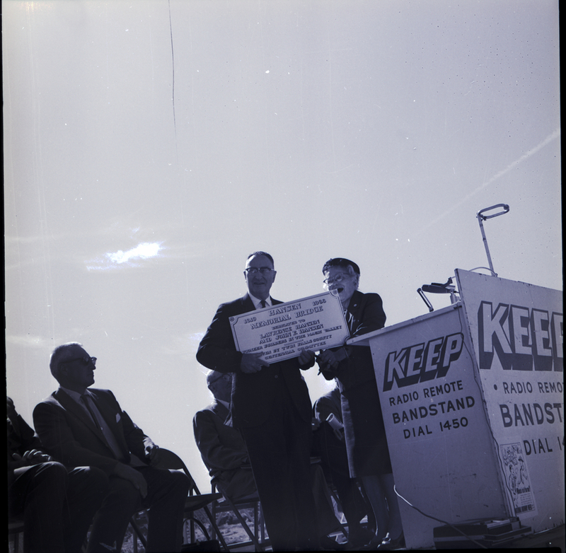 Dan Cavanagh, pioneer builder and contractor for the Hansen suspension bridge, holds up a sign that reads "1919 - 1966 Hansen Memorial Bridge, Dedicated to Lawrence Hansen and John F. Hansen, Pioneer Builders in the Magic Valley. Given by Twin Falls County Centennial Committee" at the Hansen Bridge dedication. Anna Hansen Hayes stands beside him, dressed in a jacket, skirt, and hat. In front of them is a podium that reads "KEEP Radio Remote Bandstand Dial 1450." Several men wearing suits and ties sit in folding chairs on the stage behind them.