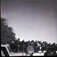 A group of men dressed in suits and ties, including Govenor Smylie, Congressman Hansen, and Senator Jordan, and a woman in a dress sit in folding chairs on stage with their heads bowed, observing a moment of silence, at the Jerome Road dedication. Two planes fly by above them. The heads of spectators can be seen in front of the stage, and behind it are some trees.