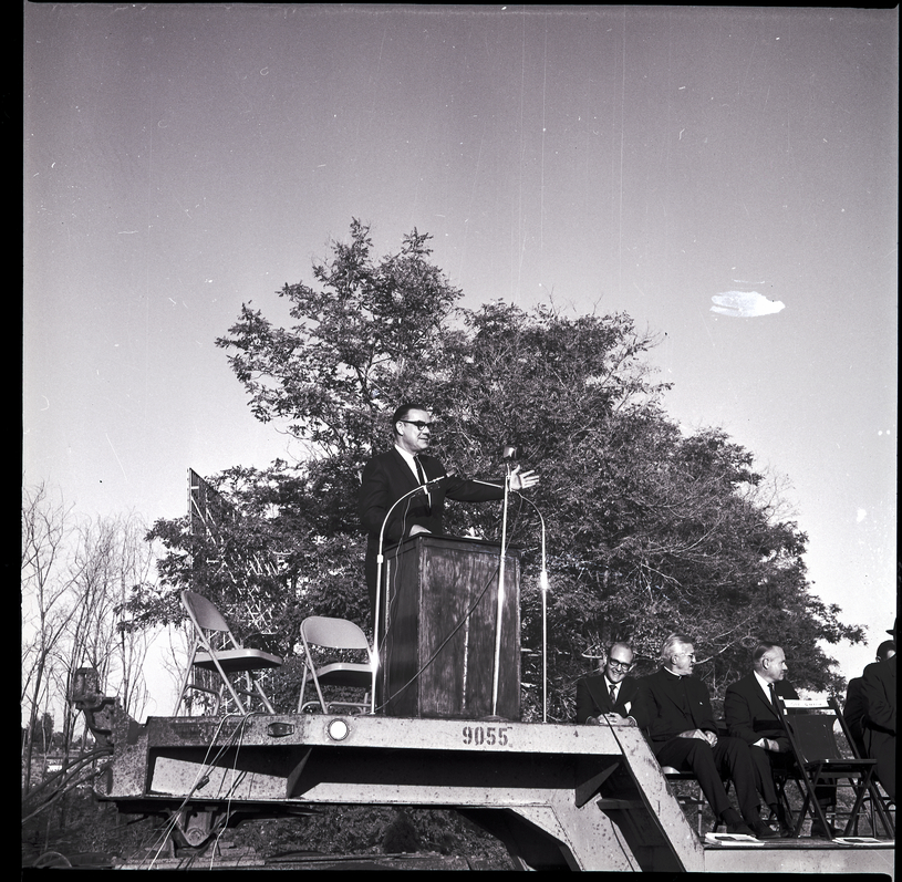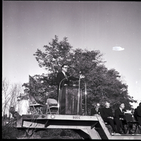 Governor Robert E. Smylie stands behind a podium giving a speech to a crowd of more than 550 Magic Valley residents at the official opening of two sections of Interstate Highway 80 N between Burley and Jerome. He is dressed in a suit and tie. Several other men sit in folding chairs to the side on the stage. Behind the stage are several trees.