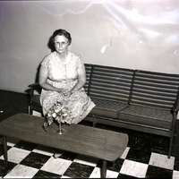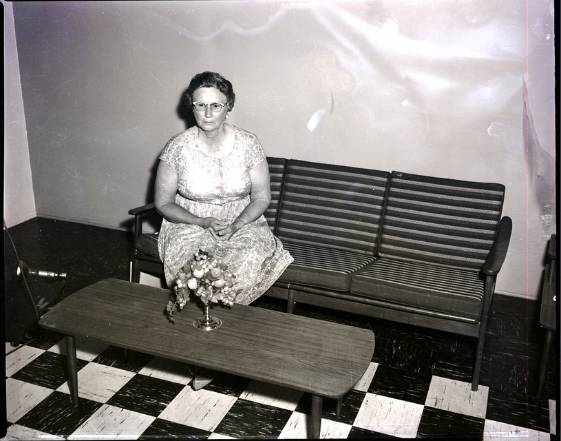 Mrs. Floyd Bandy, president of the Bowl 'n Blossom Club, sits on a couch. She is wearing a patterned dress. In front of the couch is a table, and on the table is a centerpiece of fruit and flowers.