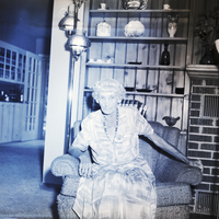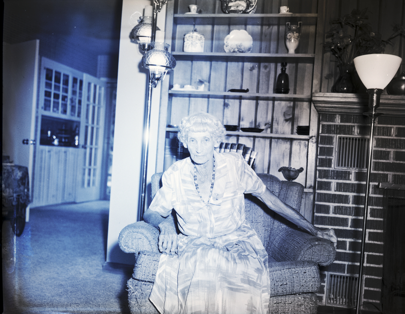 Mrs. Ruby Smith, president of the ladies auxiliary to the United Spanish War Veterans, sits in a recliner. Behind her is a bookcase filled with books and glass antiques. Some standing lamps surround the recliner. To the right is a fireplace, and on the mantle are some vases filled with flowers. The kitchen is visible through a doorway to the left.