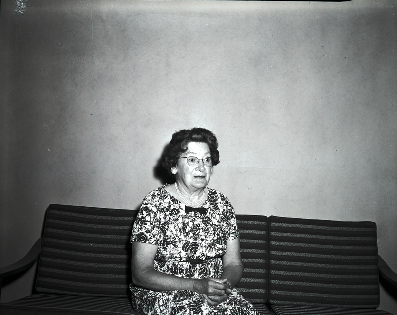 - Mrs. Mary Stearns, president of the Twin Falls Triple Link Club, a subordinate to Primrose Rebekah Lodge No. 76, sits on a couch. She is wearing a floral print dress and a pearl necklace.