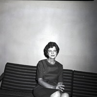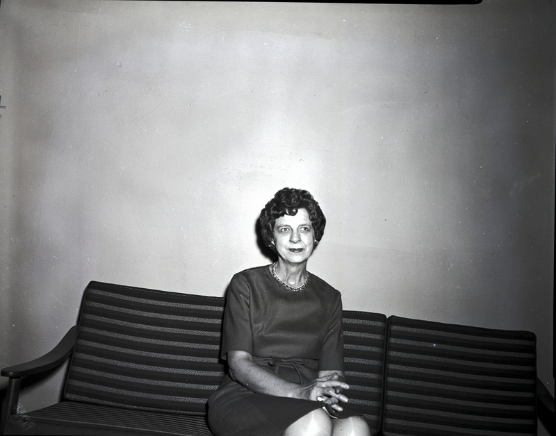 - Mrs. Lynn Popplewell, president of the Cheerful Matrons, sits on a couch. She is wearing a dress.
