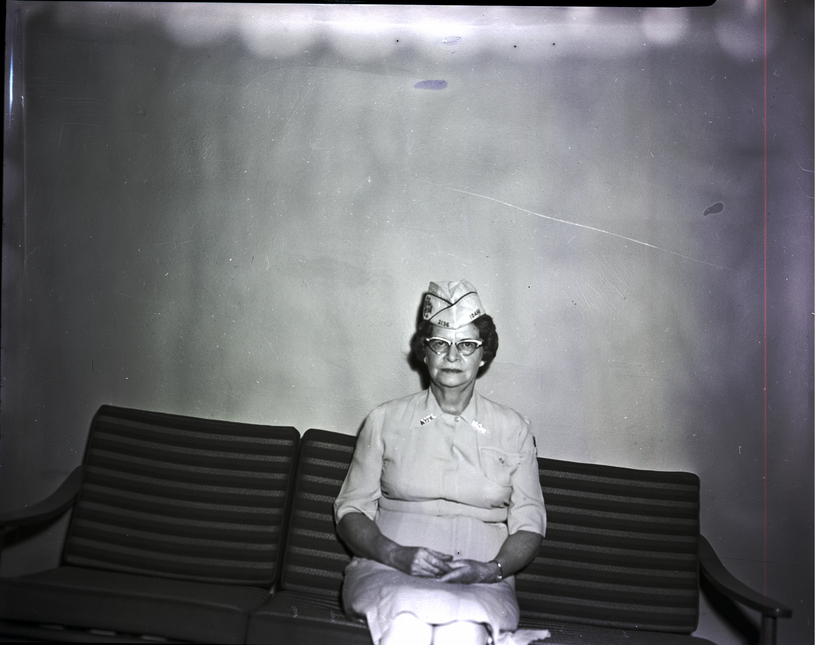 Mrs. Robert Messenger, president of the Twin Falls Auxiliary to Veterans of Foreign Wars, sits on a couch. She is wearing a Veterans of Foreign Wars Auxiliary uniform dress and cap.