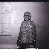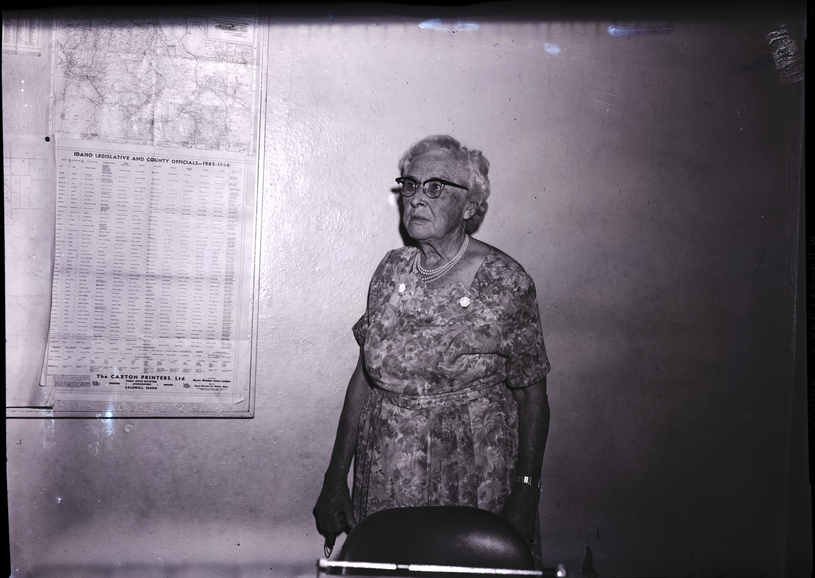 Mrs. Jessie Davis, president of the Salmon Social Club, stands beside a wall. She is wearing a floral print dress. Hanging on the wall beside her is a map of the state of Idaho that reads "Idaho Legislative and County Officials -- 1965-1966."