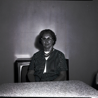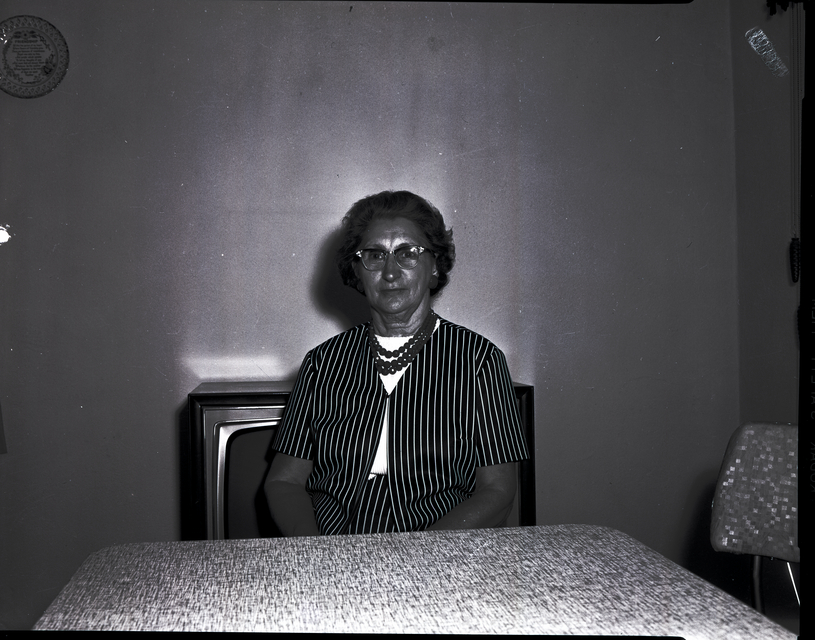 - Mrs. Wallie Holmgren, president of the Union Pacific Old Timers Auxiliary No. 31, sits in a chair behind a table. She is wearing a white blouse and a striped jacket and skirt. A television is behind her. A collectible plate hangs on the back wall.