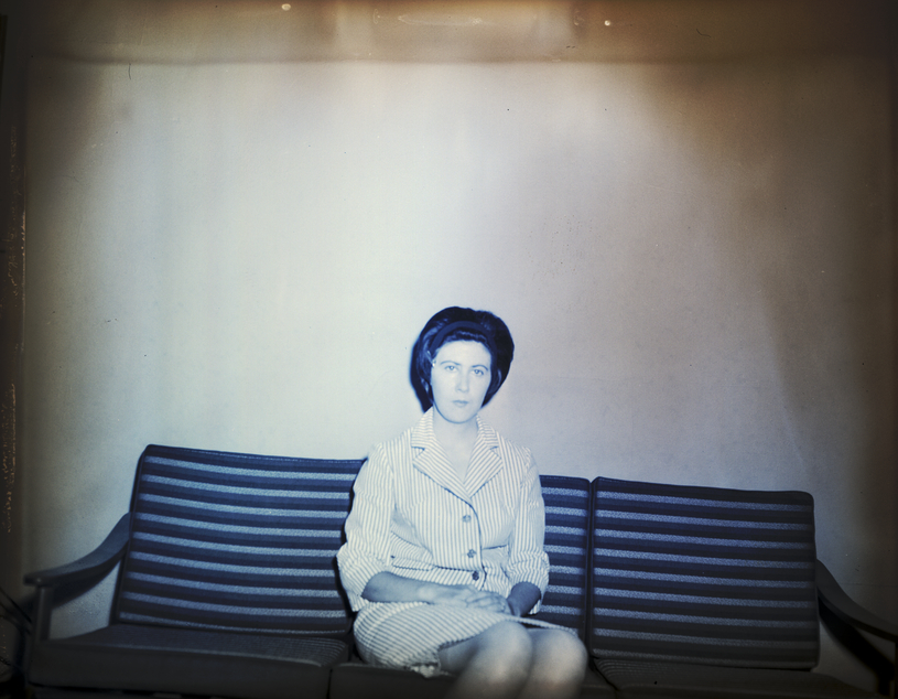 - Mrs. D. L. McFarland, president of the Twin Falls Epsilon Sigma Alpha Alpha Nu Chapter, sits on a couch. She is wearing a striped button-up dress.