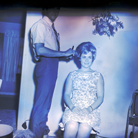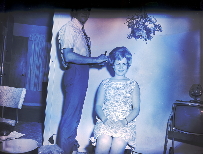 Gail Burkinshaw, representative for Sherwood Wig Co. of Salt Lake City, styles a wig for Mrs. Sue Hoffman. He is wearing a striped shirt, tie, and slacks, and she is wearing a sleeveless floral print dress. Some round boxes holding other wigs and hairpieces are on the floor. In the corner of the room is a television. A flower ornament hangs from the wall above them. Another room is seen through a doorway to the left.
